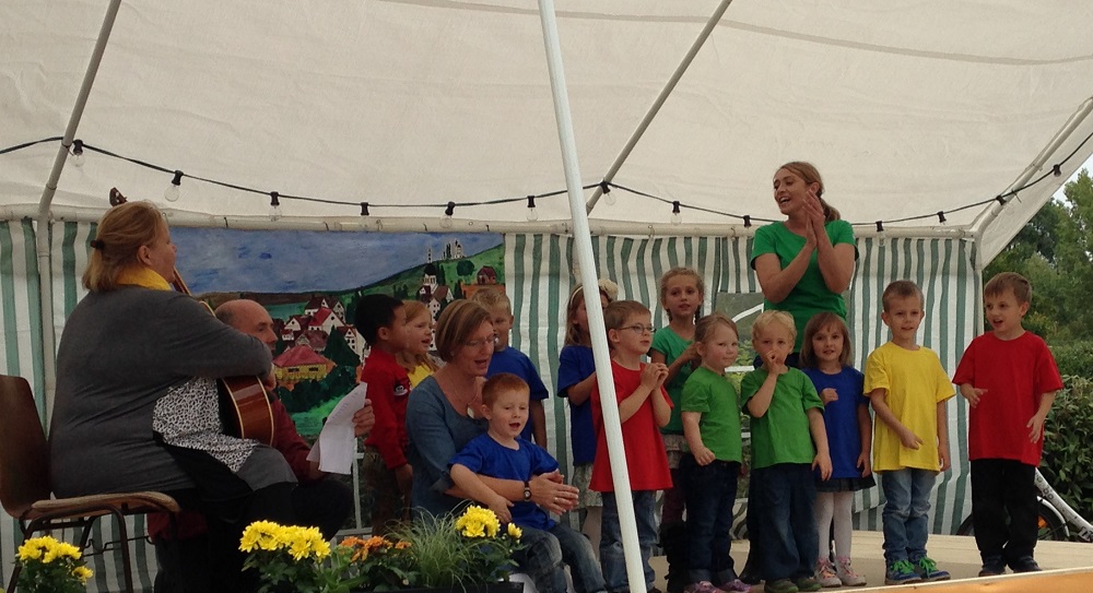 Erstmals nach dem Aufstellen des Kerbebaums führten die Kinder ein kleines musikalisches Programm auf, die Eltern boten Kaffee und Kuchen an.